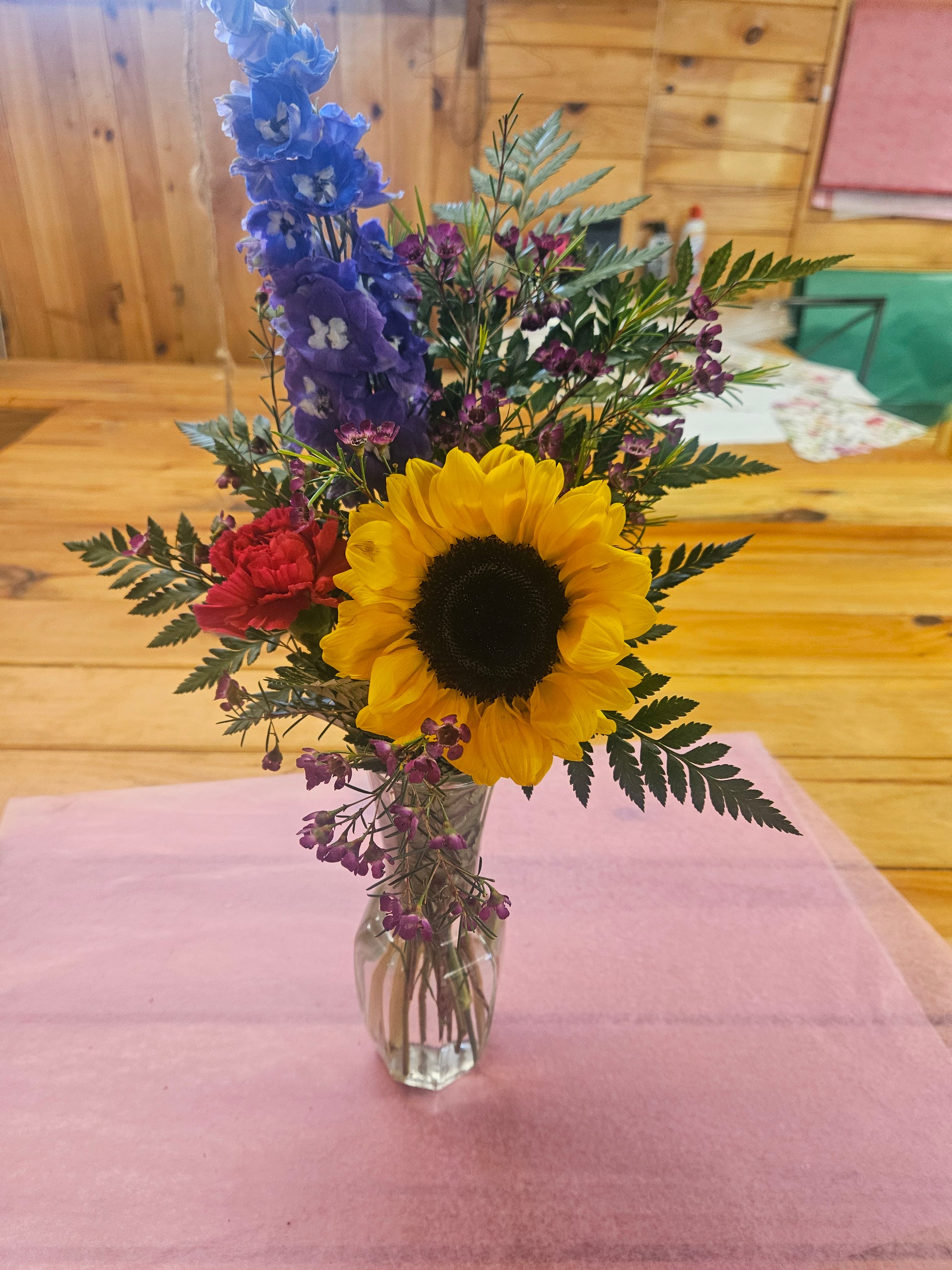Looking for something simple and cheerful? this arrangement includes 3 to 4 flowers of whatever fun things are in stock along with a heavy hand of accents and greens.